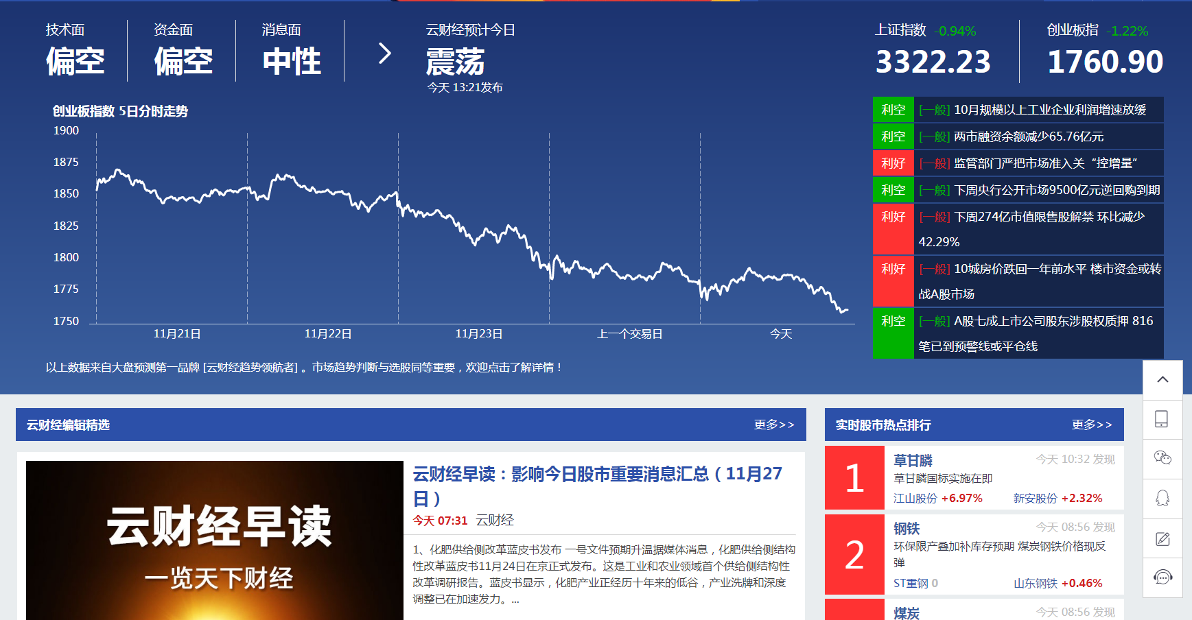 今天涨停家数较上一交易继续走低,两市共22家涨停;跌停41家。盘面上热点较为冷清,大盘低位震荡整理,家电、白酒等白马板块下挫,银行、保险等金融股表现低迷,午后,煤炭、军工等多个板块回落,沪指跌逾1%,深成指持续下挫,创业板指尾盘震荡跳水。