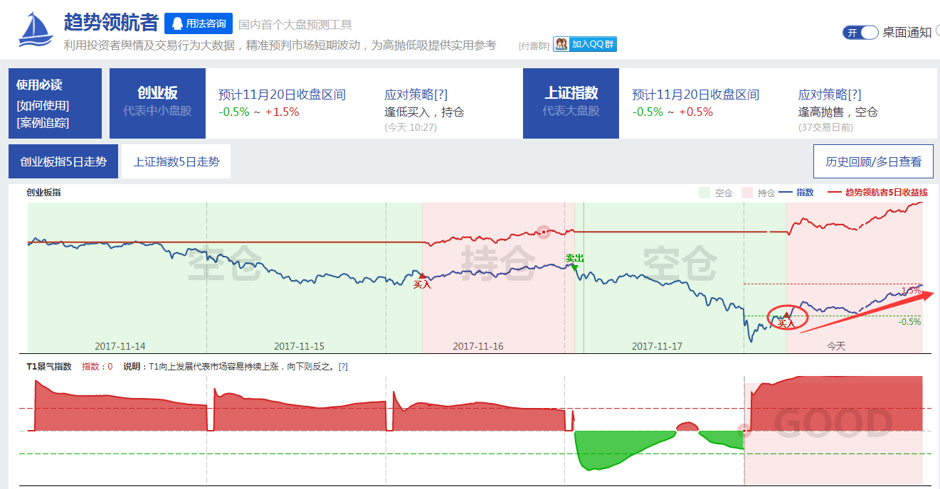 今日两市早盘惯性下跌后迎来暴力反弹,沪指探底回升收复60日线,创业板V形反转最高点收盘,涨幅1.41%。盘面上,芯片概念再度爆发领涨两市,人工智能、网络安全、5G等科技股涨幅居前,证券、保险、白酒等板块跌幅居前。数据上,两市T1指标开盘即爆表,反应出投资者强烈的看涨预期,早盘创业板多空比数据已出现空头撤退多头进攻的迹象,趋势领航者敏锐监控到主力资金的东西,并及时发出买入信号,提示中小创抄底机会。