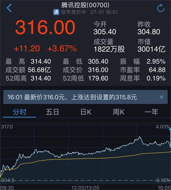 云财经讯,腾讯市值再创纪录,报316港元,涨3.67%,以此计算腾讯市值首次突破了3万亿港元大关。近段时间以来,腾讯股价接连创新高,今年腾讯股价上涨幅度已超过60%。