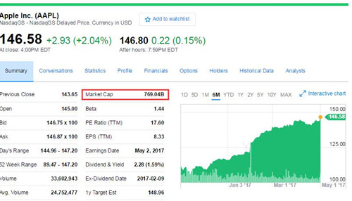 在股价创下新高之后,苹果市值也创下了新高,按周一收盘时的股价计算,苹果市值已到达了7690亿美元。