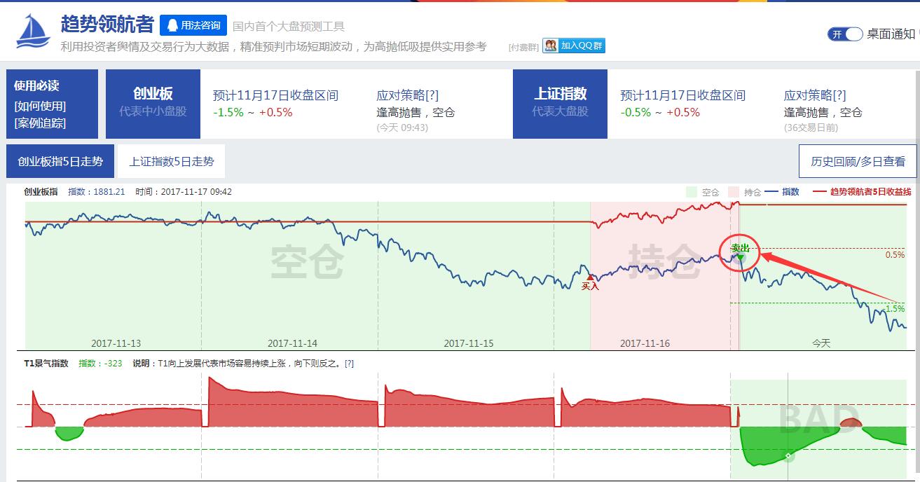 云财经领航者趋势预判系统早在11月10日(上一波反弹到达顶部前1天)就提前发出了清仓避险信号,11月16日的一日游反弹也发出了买入信号,11月17日开盘不久监控到市场抛售潮的前期特征,于9:43及时发出紧急清仓信号,云财经的几个主流选股模型,得益于集成了市场趋势因子,今日所有模型都没监控出优选股票,完美回避市场系统性风险。点击查看>趋势领航者预判系统